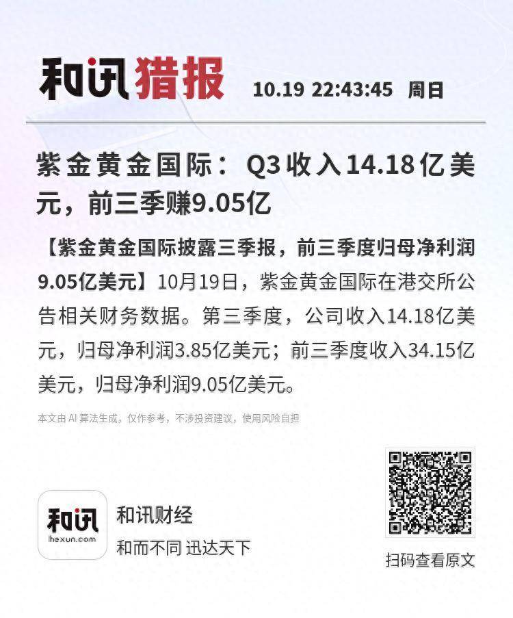 【紫金黄金国际披露三季报,前三季度归母净利润9.05亿美元】10月19日,紫金黄金国际在港交所公告相关财务数据。第三季度,公司收入14.18亿美元,归母净利润3.85亿美元;前三季度收入34.15亿美元,归母净利润9.05亿美元。
