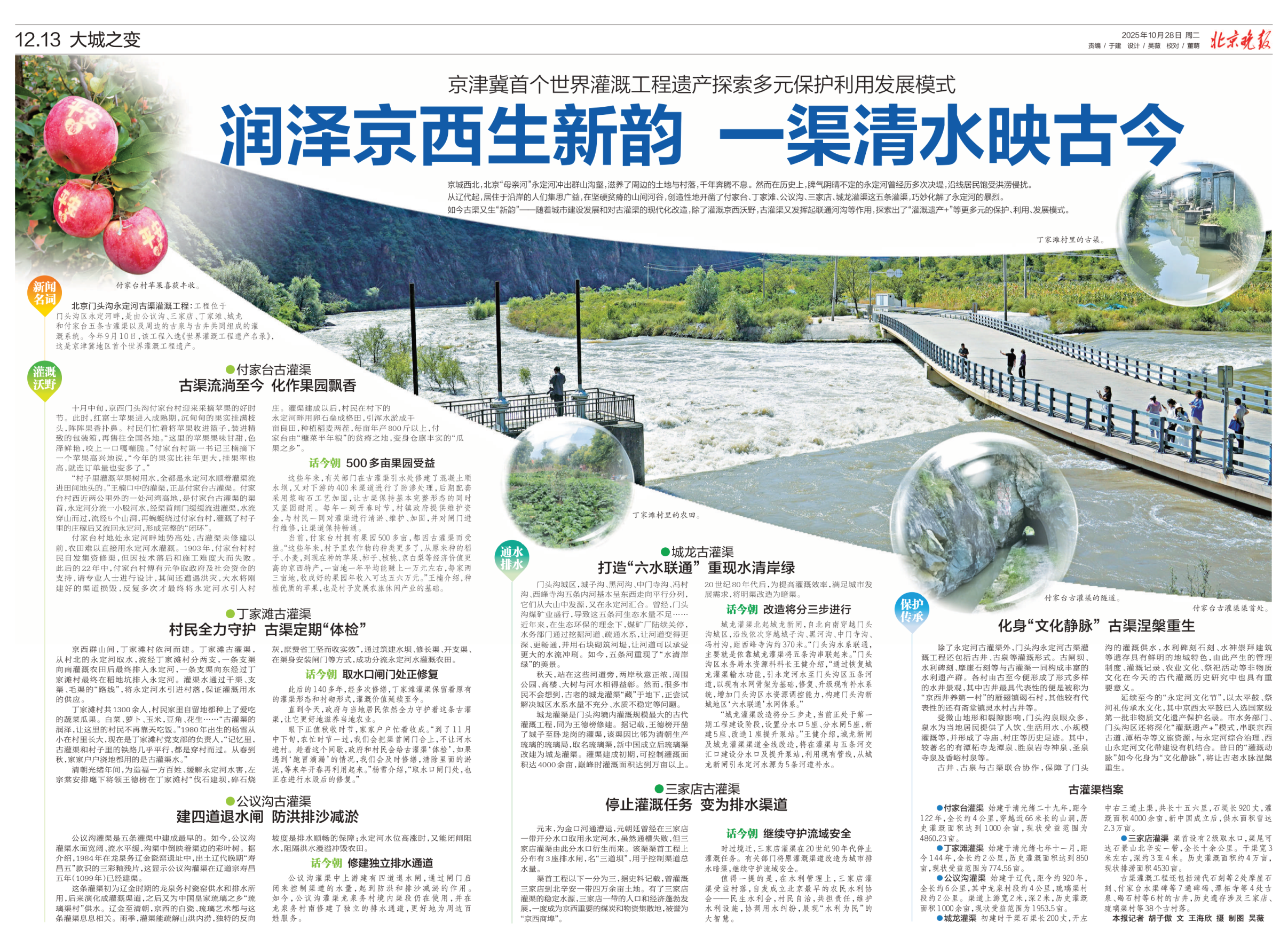 从辽代起居住于永定河沿岸的人们集思广益在坚硬贫瘠的山间河谷创造性地开凿了付家台、丁家滩公议沟、三家店、城龙灌渠这五条灌渠巧妙化解了永定河的暴烈这五条灌渠以及周边的古泉与古井共同组成了北京门头沟永定河古渠灌溉工程今年9月10日,该工程入选《世界灌溉工程遗产名录》这是京津冀地区首个世界灌溉工程遗产如今古渠又生“新韵”它们除了灌溉京西沃野还发挥着联通河沟等作用