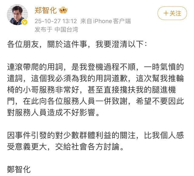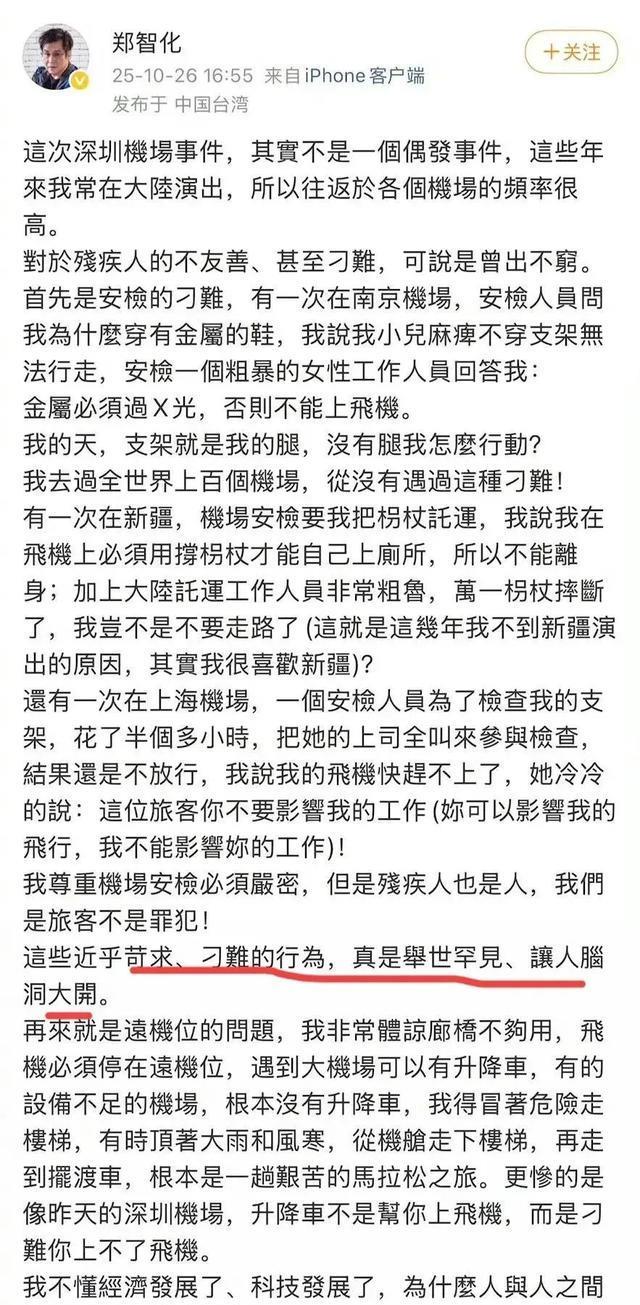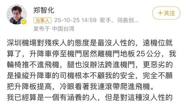 10月25日,一向低调的郑智化突然在网上发声,怒斥深圳机场对残疾人的态度没人性,工作人员冷眼看他连滚带爬进飞机。