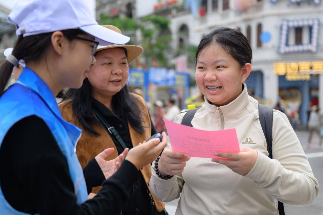 “文明旅游,从我做起,爱护环境,不乱扔垃圾,不破坏公物,不损毁文物……”在“20秒文明宣言挑战”现场,游客们争相领取宣言文稿,在志愿者的引导下开启朗读挑战。大家声音洪亮、态度端正,争分夺秒又流畅完整地诵读宣言,不少小朋友也主动参与其中,用稚嫩的声音传递文明力量。“成功啦!成功啦!”来自吉林的彩洁小朋友在20秒内顺利读完宣言,获得了一张南湾猴岛景区门票。