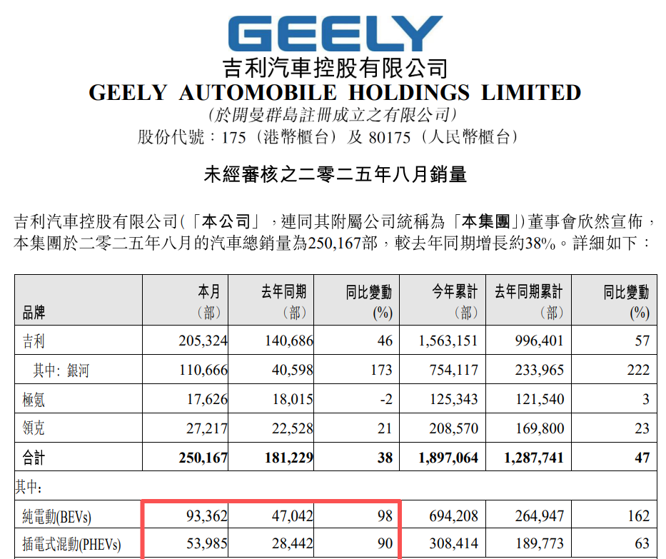 总体来看,吉利汽车8月的纯电销量同比增长98%至9.34万辆;混动销量同比增长90%至5.40万辆。