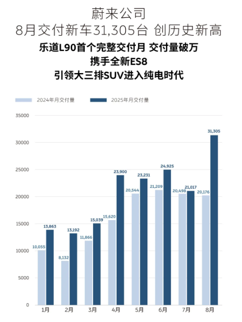 8月,蔚来交付3.13万辆,同比增长55.16%,环比增长48.95%。这是蔚来自2025年初至今,首次月度交付量超3万辆。
