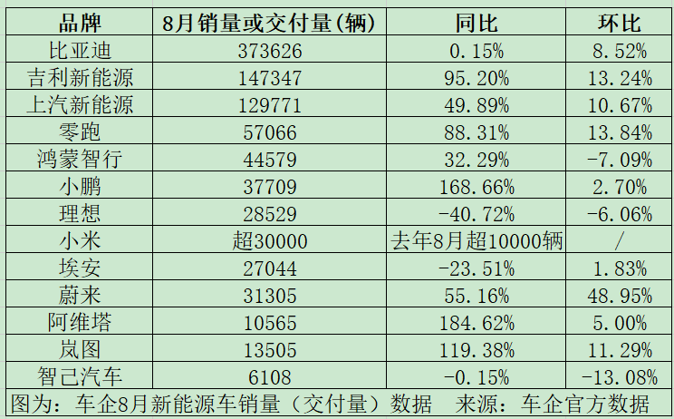 在造车新势力方面,零跑汽车8月交付5.71万辆,继续领跑其他造车新势力;网红车企小米汽车的交付量再超3万辆,凸显YU7在8月大规模交付的成效。