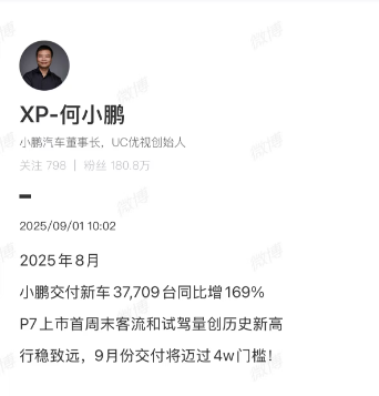 同样给外界带来预期的是小鹏汽车。9月1日,小鹏汽车董事长兼CEO何小鹏表示:“行稳致远,小鹏汽车9月交付量将迈过4万辆的门槛。”
