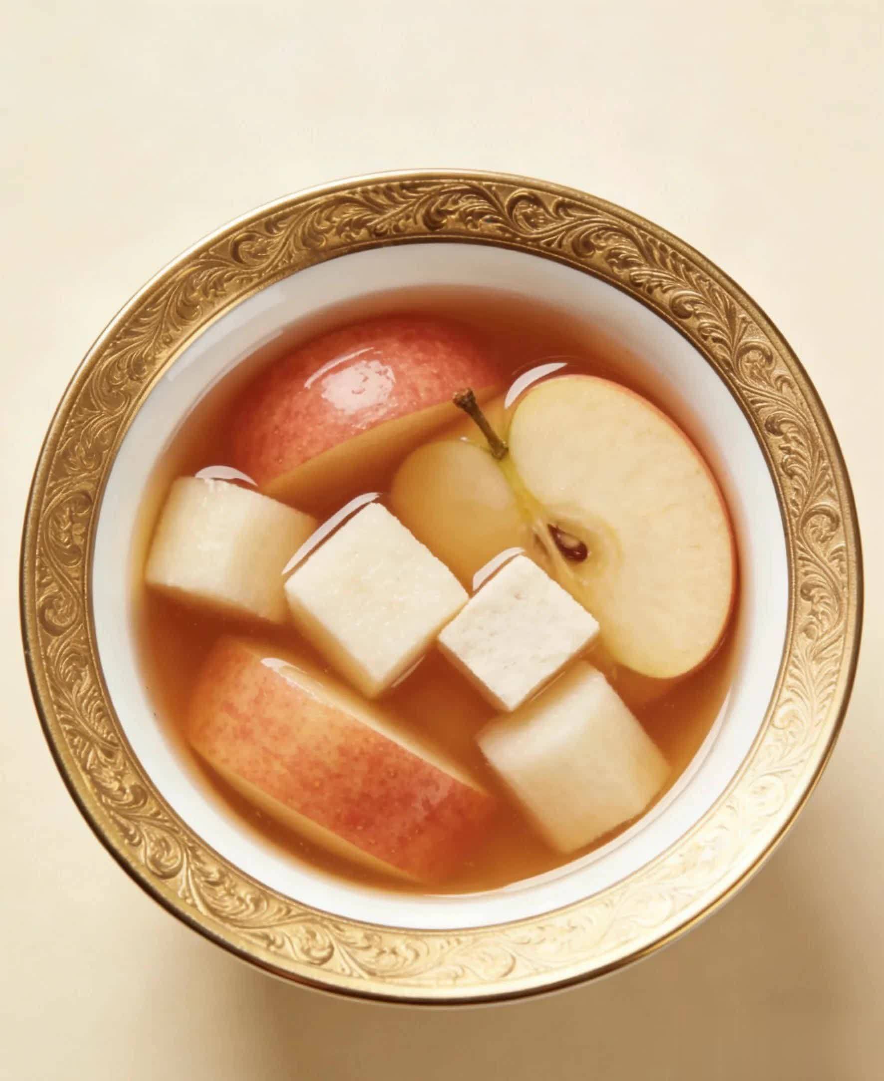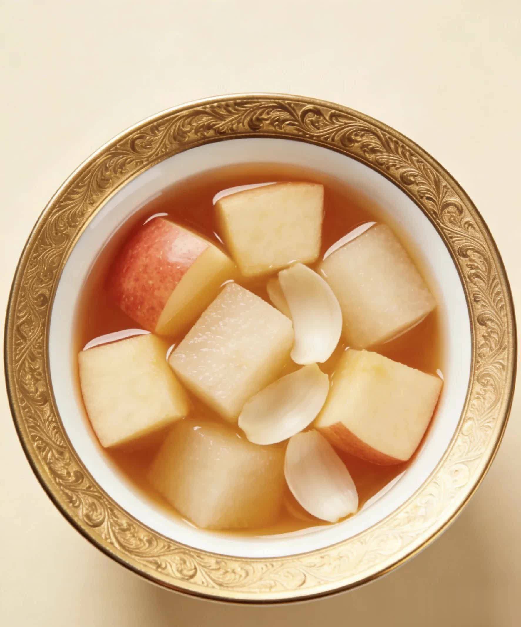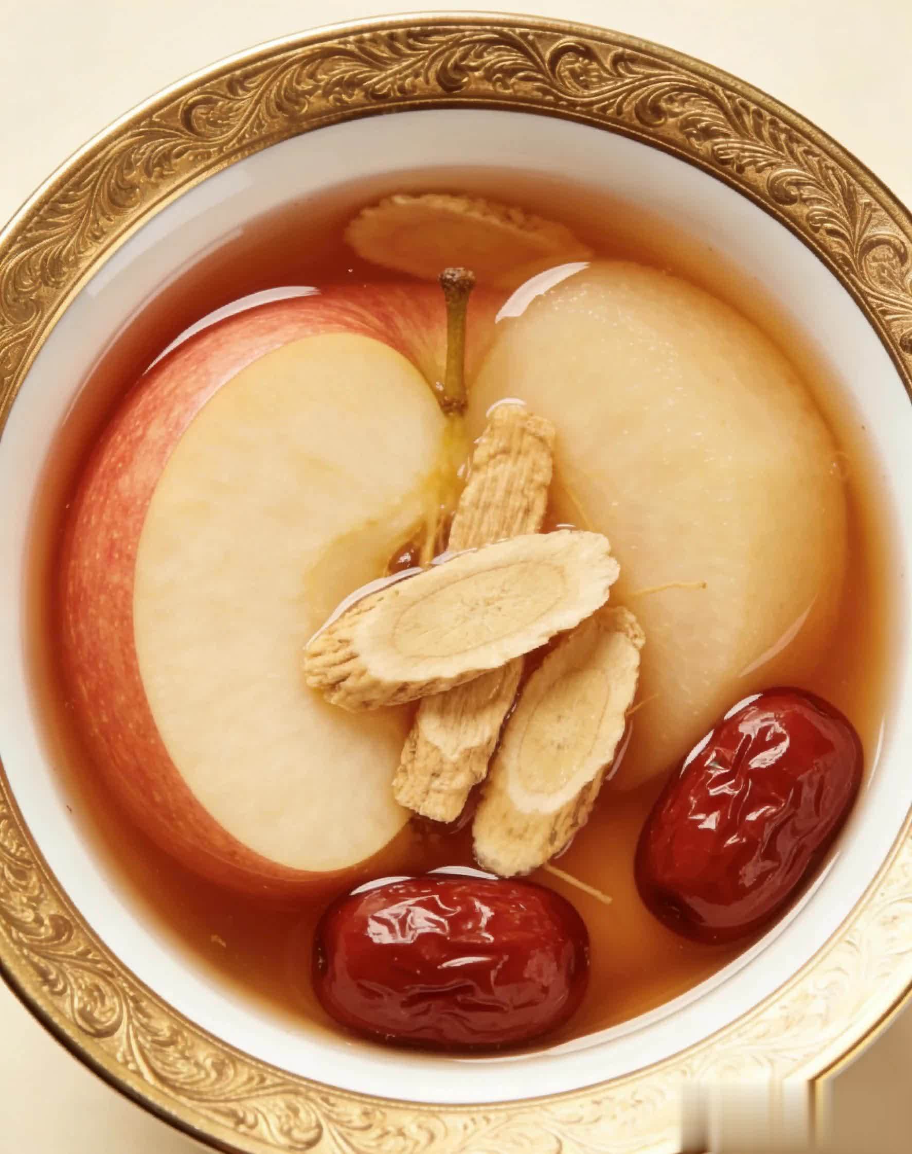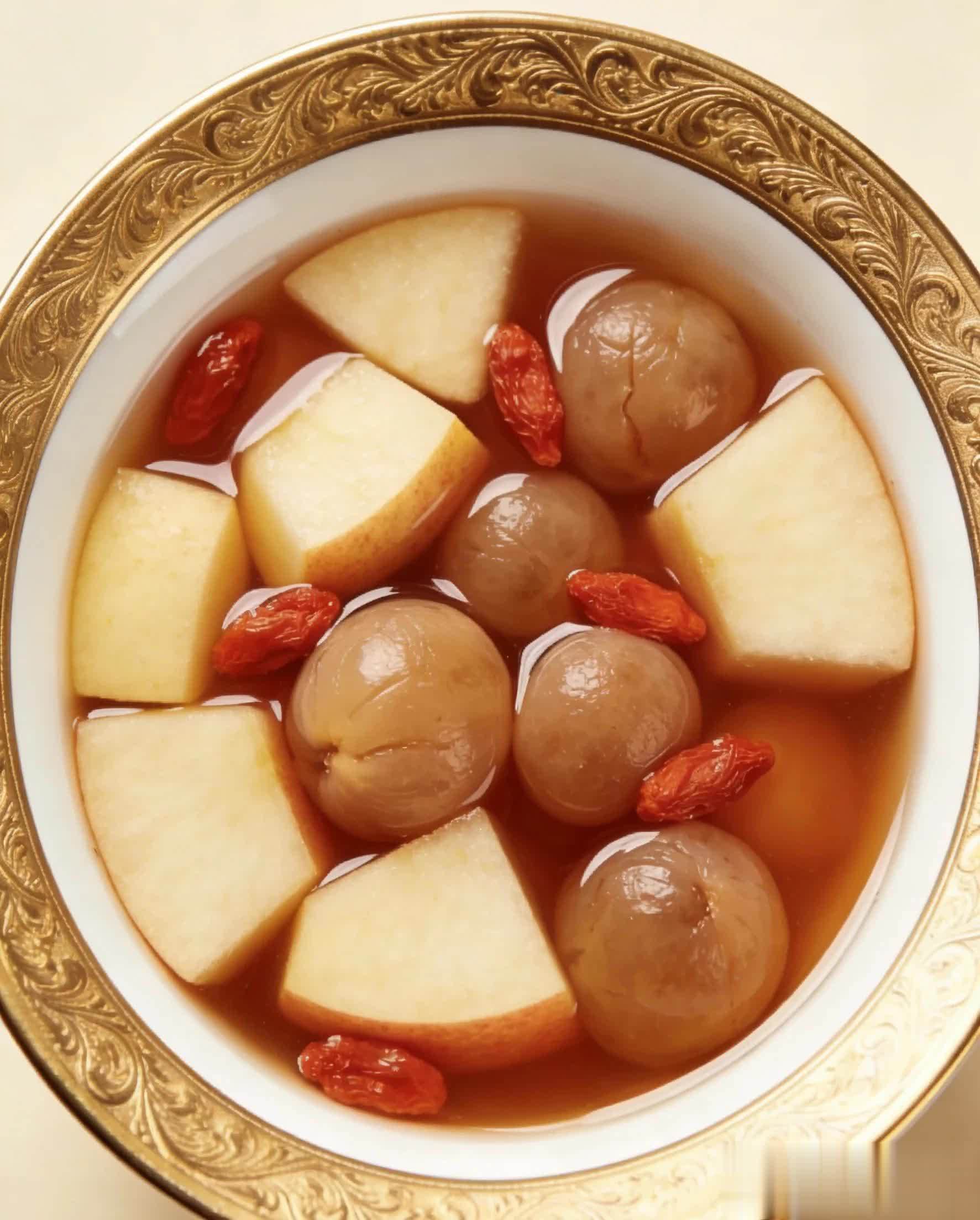 养生功效:桂圆温补气血、养心安神,枸杞养肝明目,搭配苹果的润燥之性,三者合一,既能补足气血让脸色红润,又能改善睡眠,晚上喝一碗,睡得更安稳。